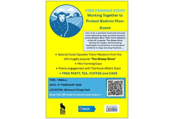 Join the Devon & Cornwall Police Rural Affairs Team, partner agencies and a very special talk from Trev from The Sheep Show on Wednesday 4 February 2026 for an engaging, practical evening focused on preventing livestock worrying and keeping farms, animals and rural communities safe.